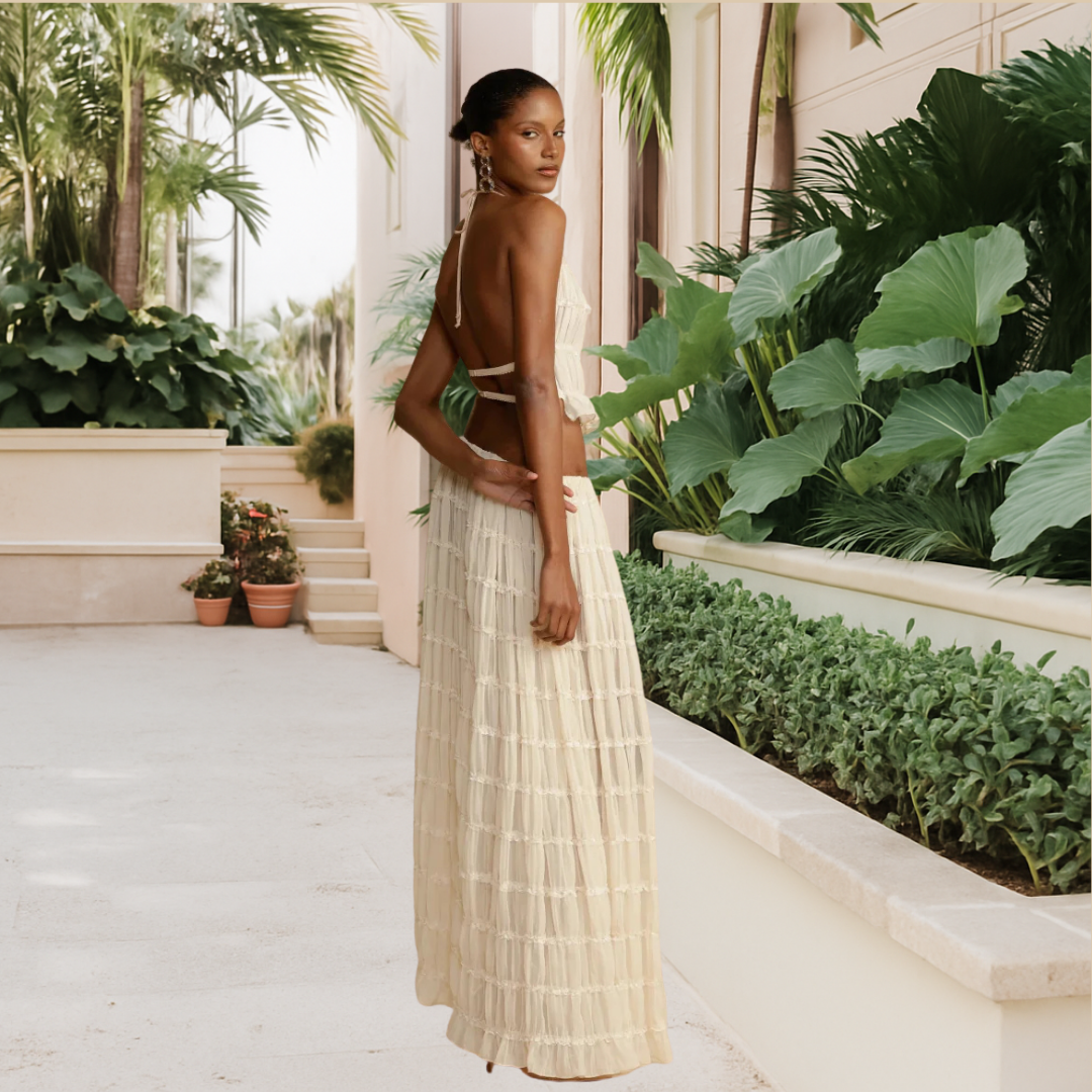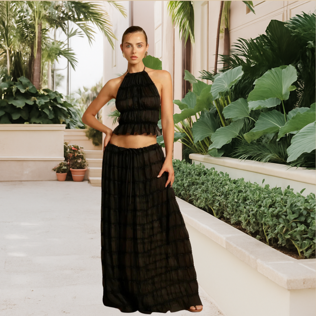 Un haut féminin accompagné d’une jupe vaporeuse et douce.
